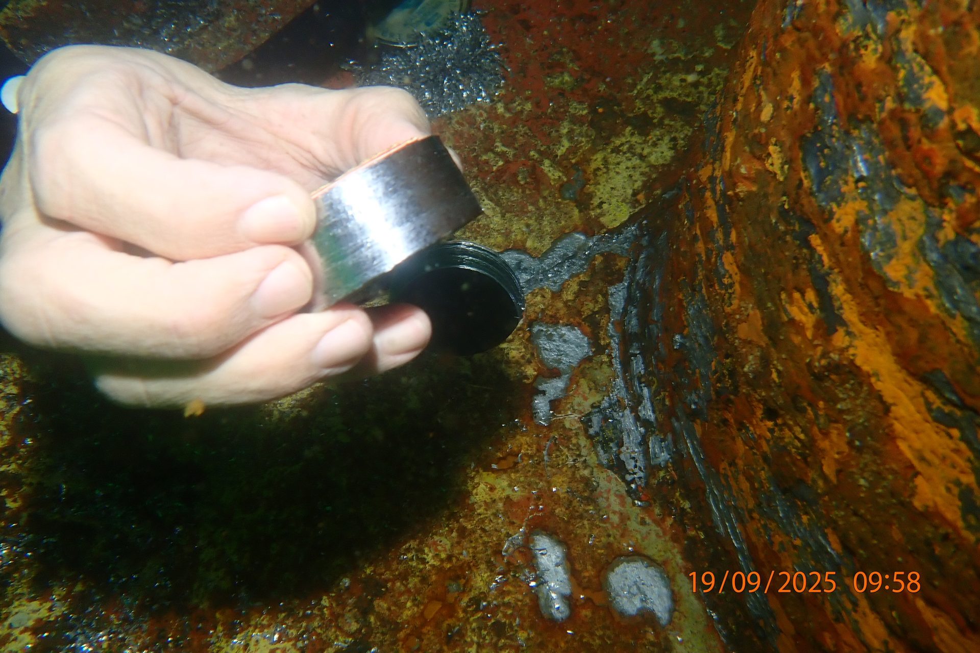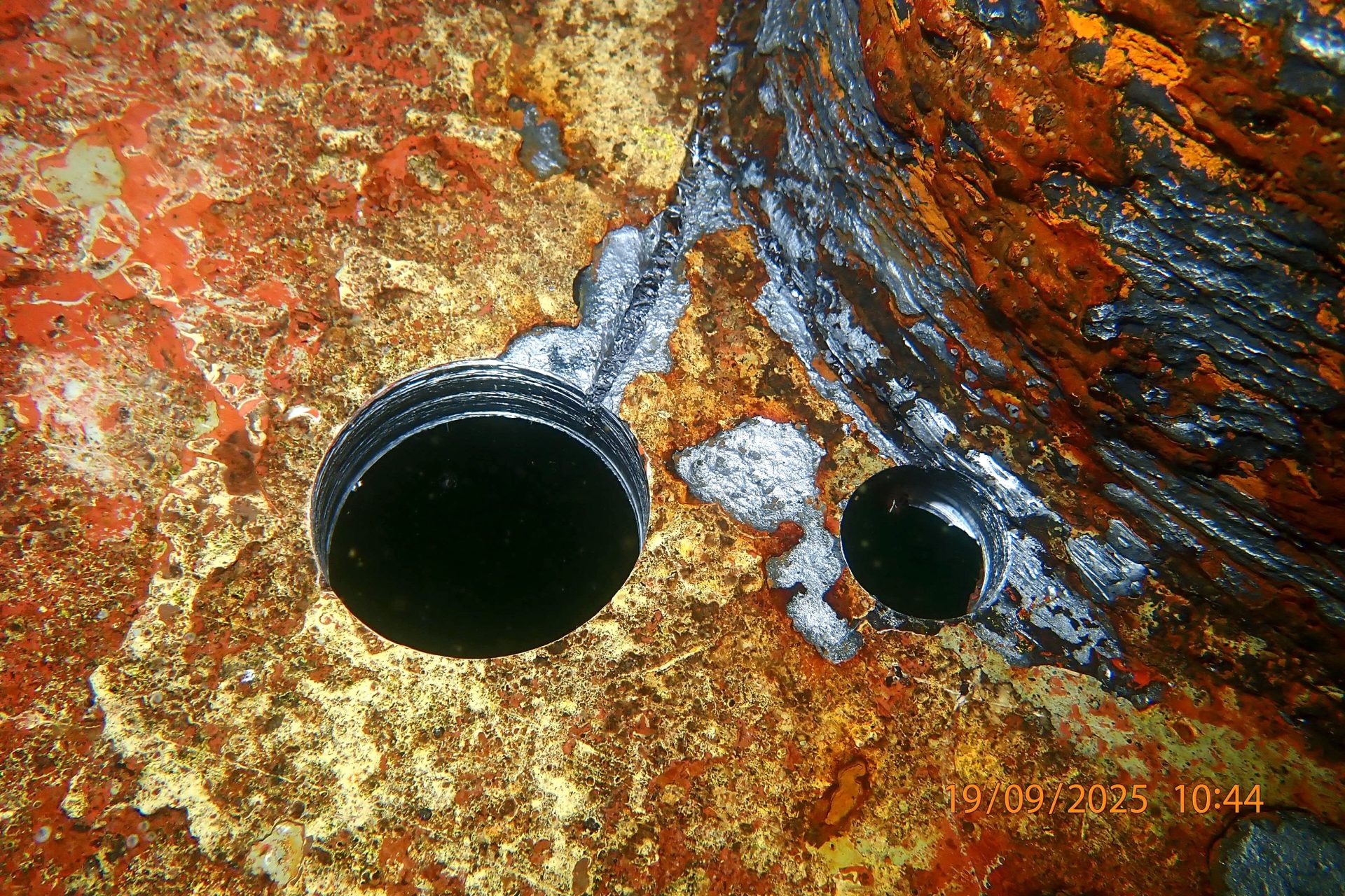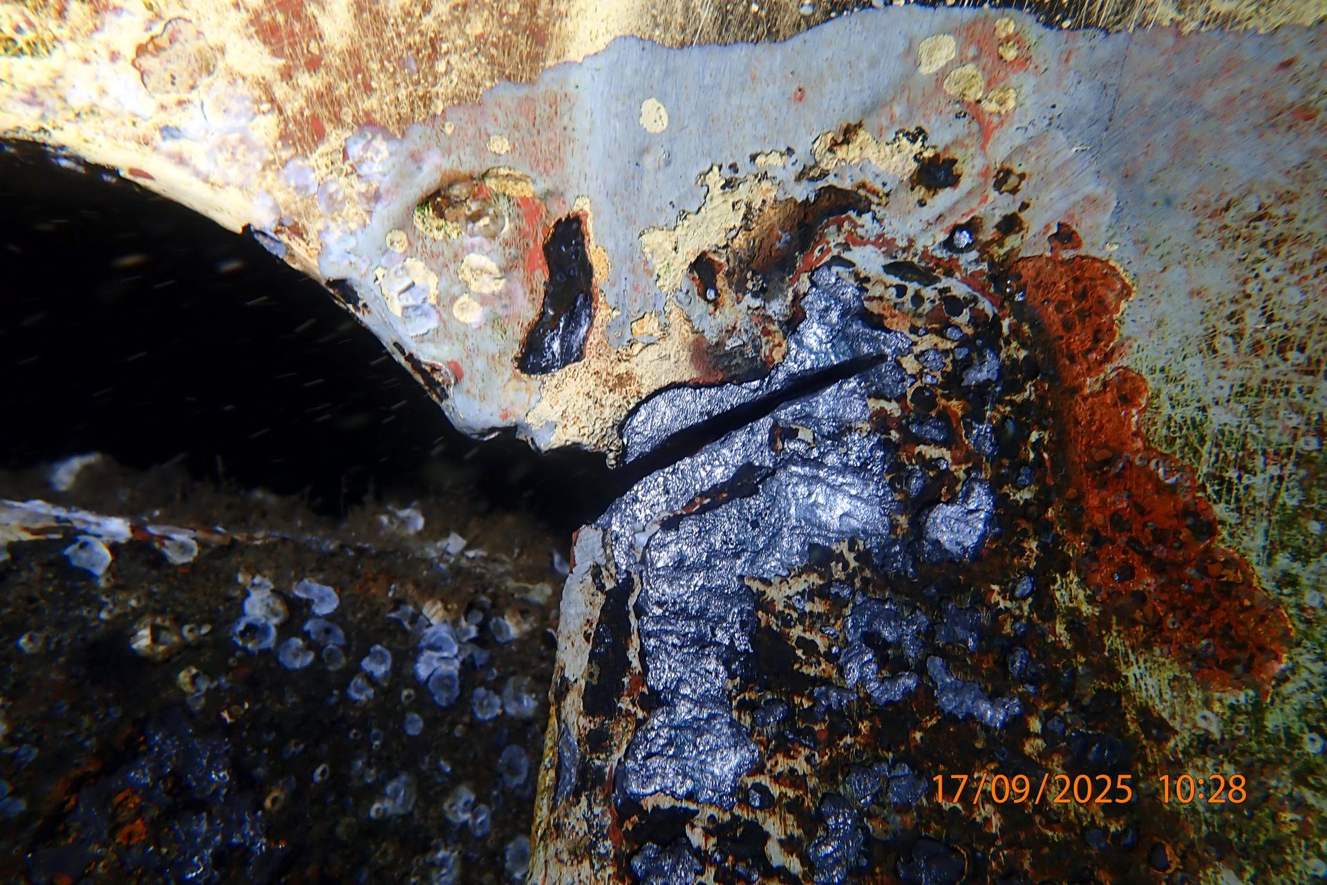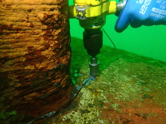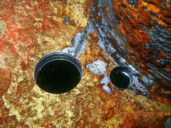 The underwater inspection confirmed a through-hull penetration to the flat bottom of the hull plating underneath the bilge tanks. Based on the data collected from this inspection, heavy corrosion from within the bilge tank had likely caused the erosion on the hull plating, resulting in a 40 mm hole.