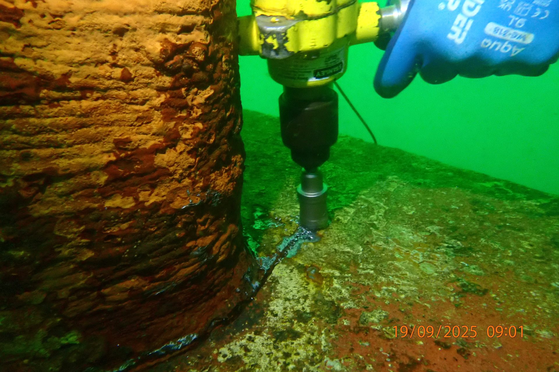 The divers executed the repair, which consisted of making-fast a steel-backed neoprene bung at the penetration site, and then shielding the repair site in epoxy.